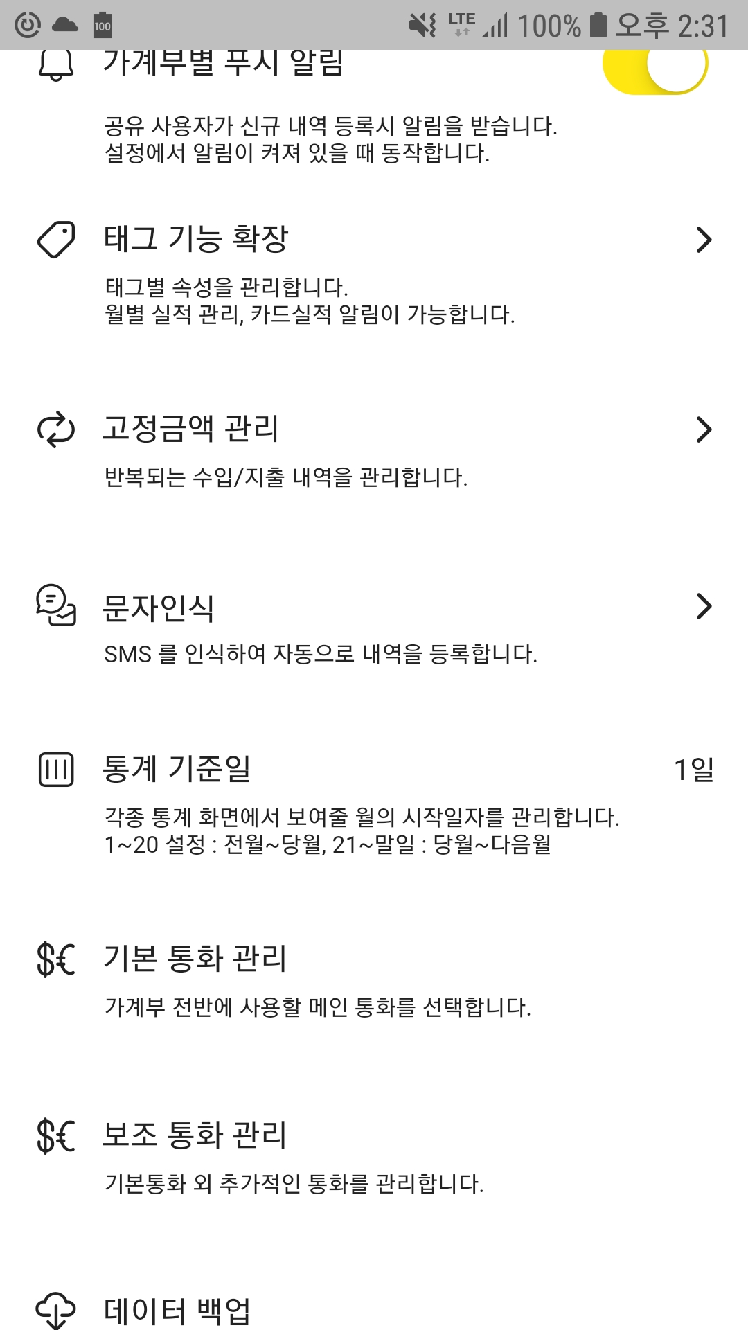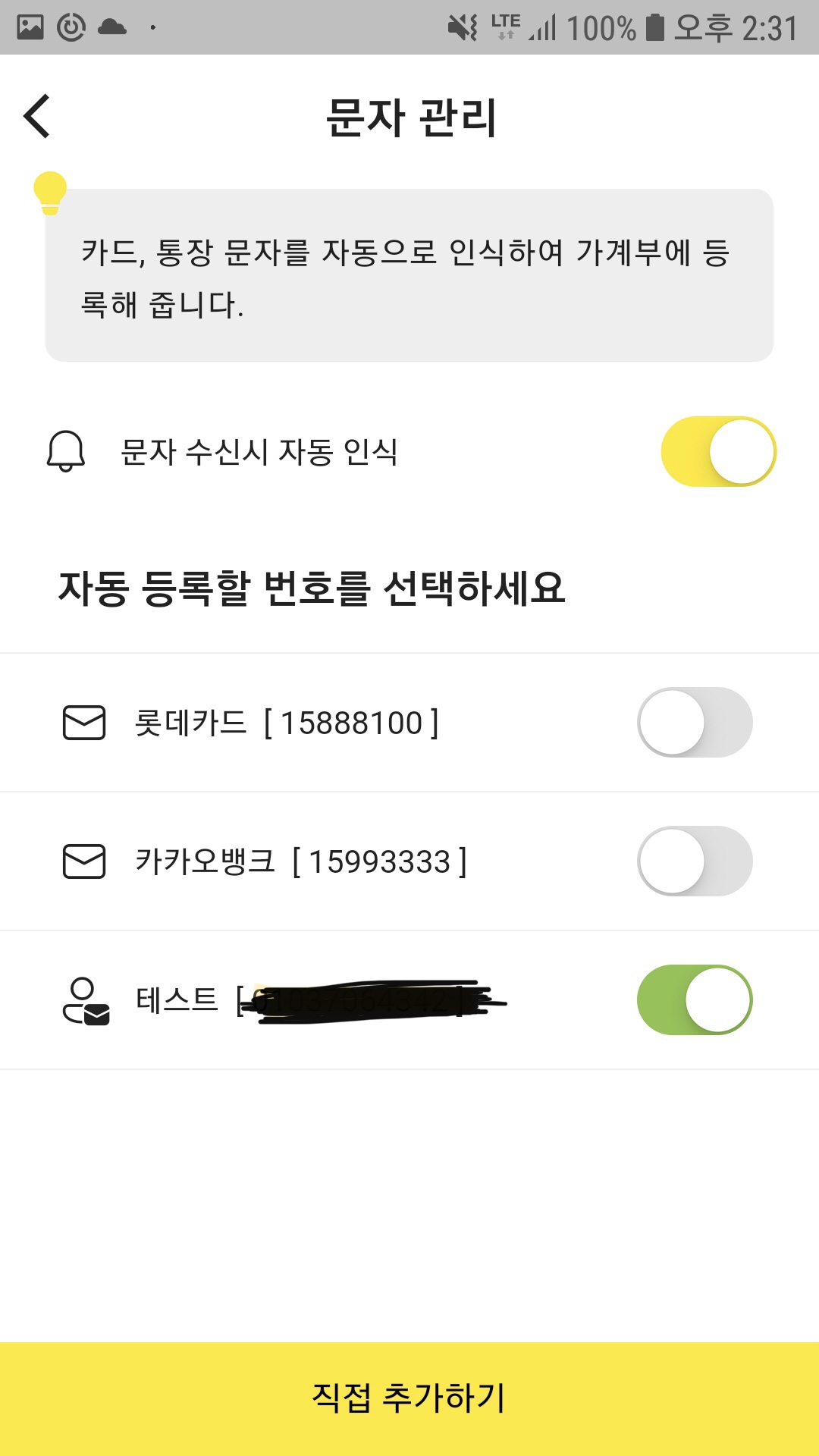 가계부 설정을 보시면 상기와 같이 문자 인식이 추가되었습니다.