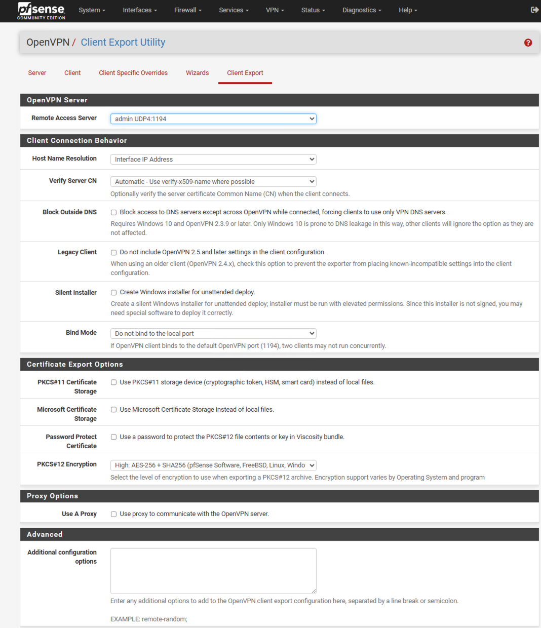 VPN - OpenVPN 에 들어가니 상단 빨간색 메뉴 끝에 Client Export 가 생겼다.